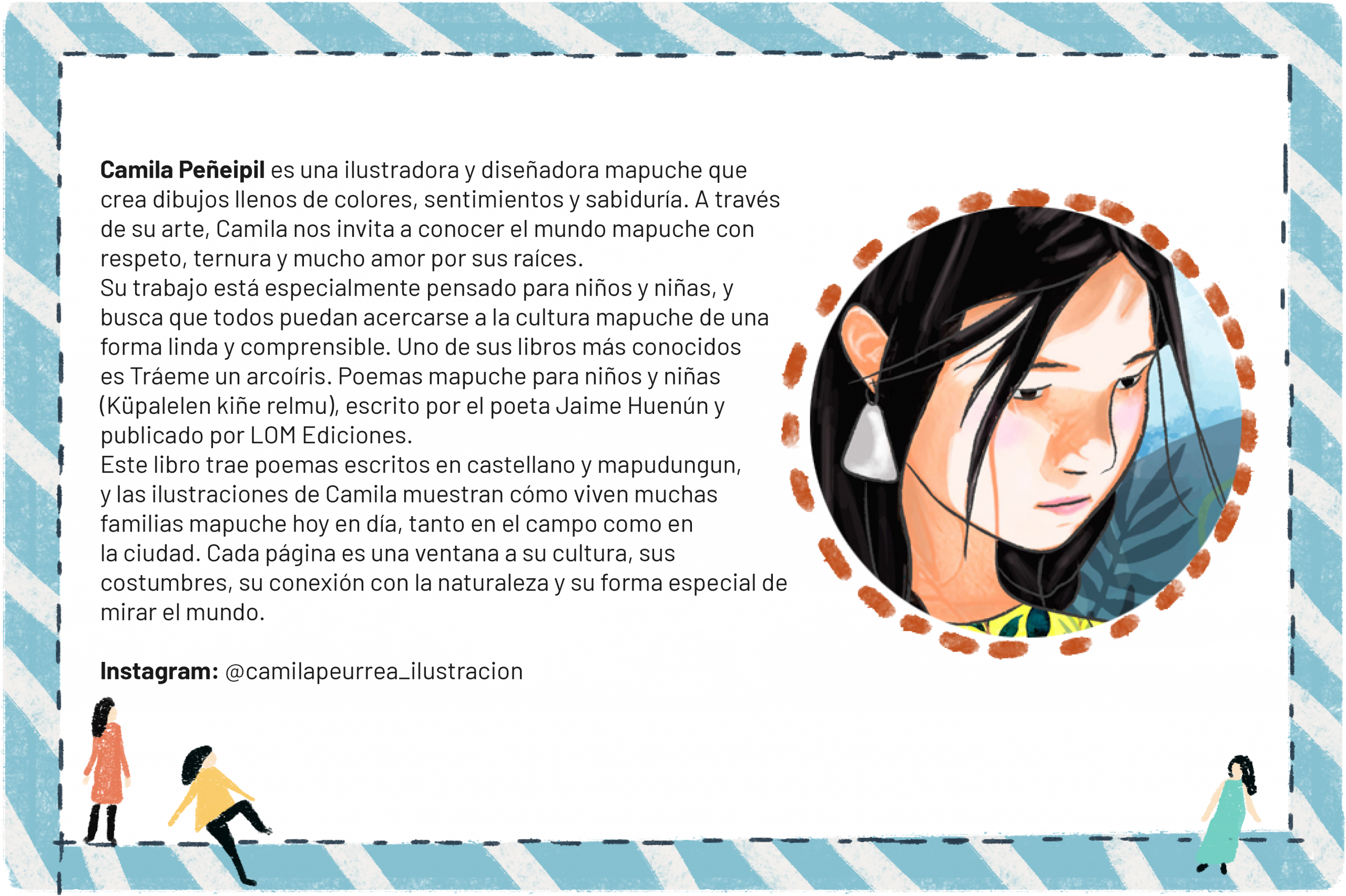 ¡Bienvenidos a Santiago! Conoceremos a Camila Peñeipil, ilustradora mapuche que ha dado vida al libro Tráeme un arcoíris, un poemario bilingüe que retrata la vida cotidiana mapuche con sensibilidad y color.