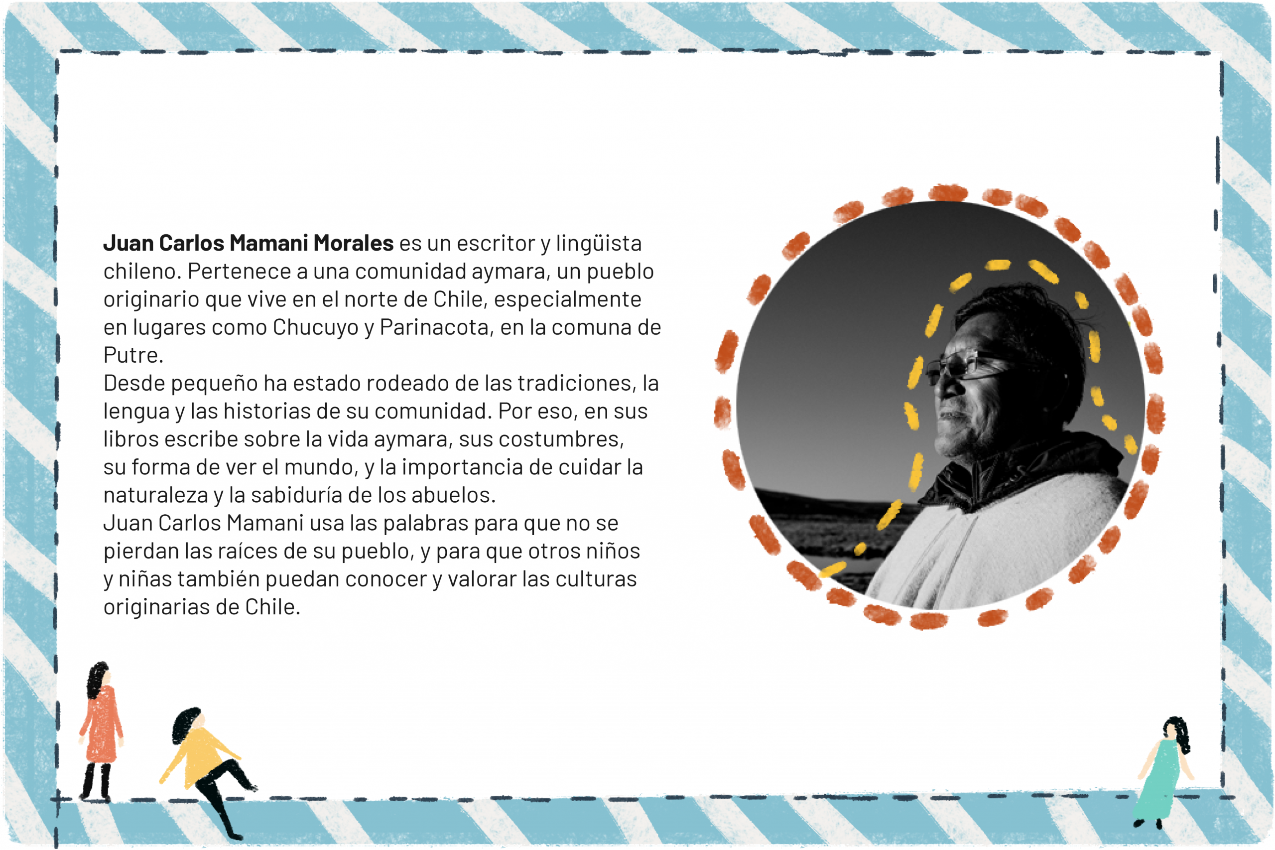 ¡Bienvenidos a los días 3 y 4 de nuestra ruta literaria! Ahora cruzamos la frontera entre Tacna y Arica, un lugar donde la historia y la naturaleza se mezclan con leyendas y tradiciones muy antiguas. Aquí conoceremos a Juan Carlos Mamani, un escritor y lingüista aymara que nos invita a mirar el mundo con los ojos de sus ancestros. Leeremos Uma y el agua de mar, un cuento sobre una niña que viaja desde el altiplano hasta el océano para ayudar a su comunidad. También descubriremos la Editorial Nifam y su amor por las historias de los Andes. Y si miramos hacia los volcanes Yucamani y Tutupaca, conoceremos una leyenda de amor y castigo contada por la tierra misma. Para cerrar este tramo, prepárate para “Volcanes con voz”, donde haremos personajes y paisajes inspirados en estas poderosas montañas. ¿Listos para seguir viajando con la imaginación? ¡Adelante!